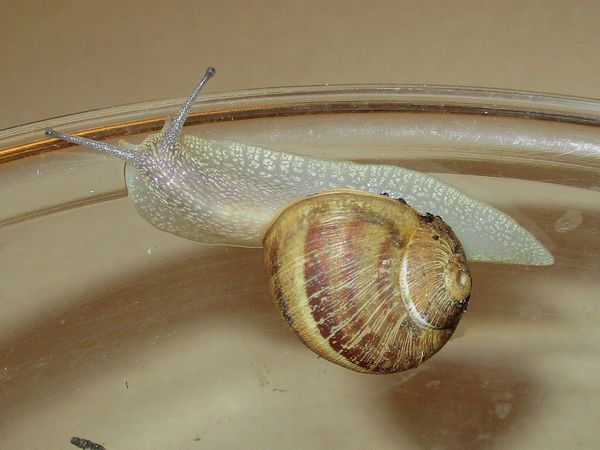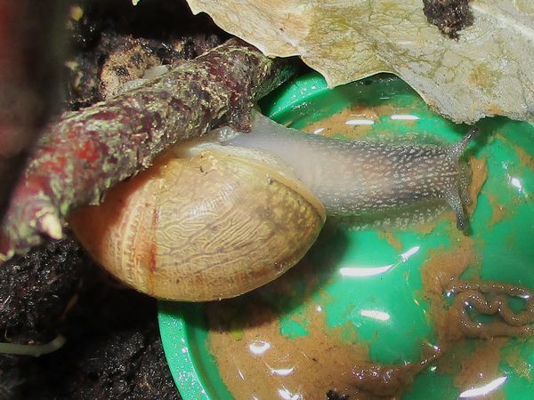 De Kleine ist jetzt meistens wach, schneckt durchs Gelände, futtert von der Gurke, schabt die Zweige ab, kontrolliert die Samen... In ihre Behausung habe ich ein kleines Deckelchen mit etwas Wasser und ein klein wenig Heilerde gesetzt. Ich hatte auch den Eindruck, dass sie da wohl mal dran war, und heute Nachmittag konnte ich dann auch beobachten, wie sie gerade ein Bad nahm.