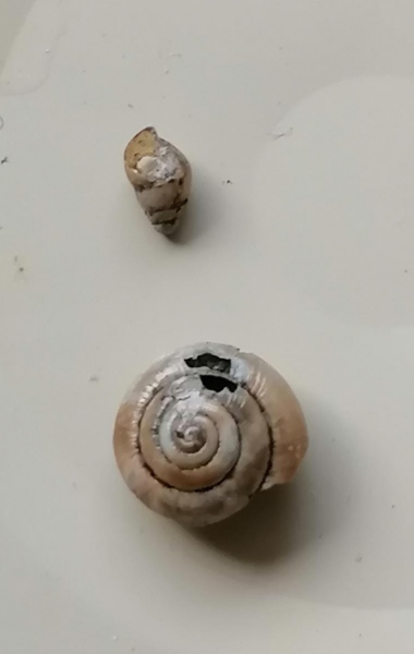 Noch unentschiedener bin ich bei dem kleinsten, leicht turmförmigen Häuschen. Meine allererste Idee ging in Richtung Cochlicopa, aber da passte nach genauerem Hinsehen die Gehäuse-Form nicht hinreichend. Vielleicht (!) ein sehr junges Exemplar aus der Familie Enidae??