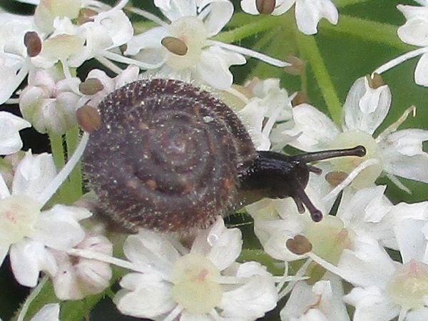 dieses hübsche Schneckchen lässt es sich auf Wilder Möhre (oder sowas Ähnlichem) gut gehen. Was für eine könnte es sein?