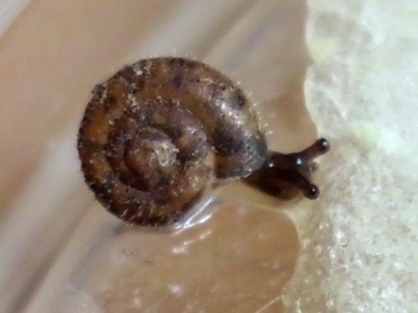 Zum Fotografieren hatte ich die Dose hingelegt, und kurz darauf traute sich das Schneckchen hervor.
