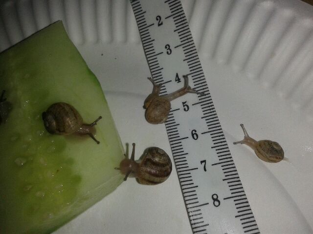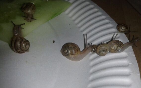 Meine Eltern haben die Büsche in ihrem Garten geschnitten und mir unterschiedliche Zweige und Äste für meine Schnecken mitgebracht. Normalerweise schneide ich mir einmal in der Woche frische Forsythienzweige für meine Schnecken. Ich drehe ja jedes Blatt einzelne um, um sicherzugehen, dass ich keine unerwünschten Untermieter bekomme. Diesmal bin ich gleich mehrfach fündig geworden. Diese kleinen Schnecken saßen auf den Blättern. Da ich selber Schnierkelschnecken habe und 3 Steinpicker(? - der erste ebenfalls mal als Blinderpassagier gekommen); und die kleinen Ihnen nicht ähneln, befürchte ich, es handelt sich bei den einfärbigen um Weinbergschnecken. Kann das sein? Ich kann sie leider erst morgen wieder zu meinen Eltern zurück bringen. Würdet ihr sie über Nacht in ein Glas oder zu den Schnierkels setzen? Hab noch nie soviel Babyschneckem auf einem Bund Zweige gesehen..