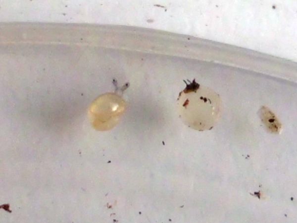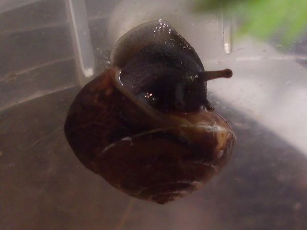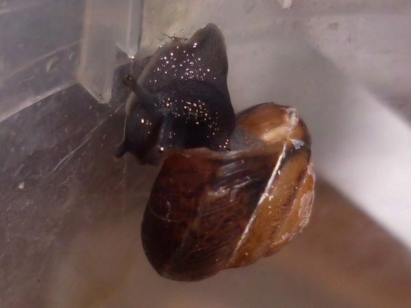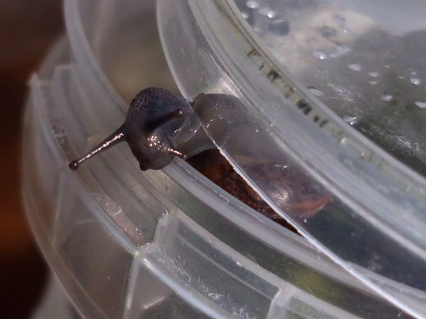 Etwas später schleimte er am Deckel entlang, also dachte ich mir, es wäre Zeit für eine Haferflocke. Aus irgendeinem Grund hat er ein Ei spazieren getragen, so sieht man mal schön das Größenverhältnis.