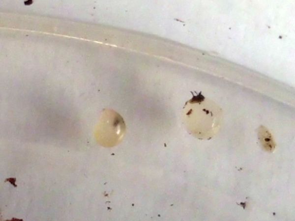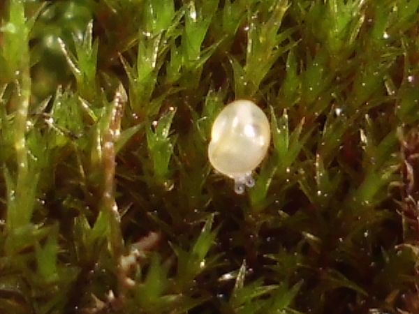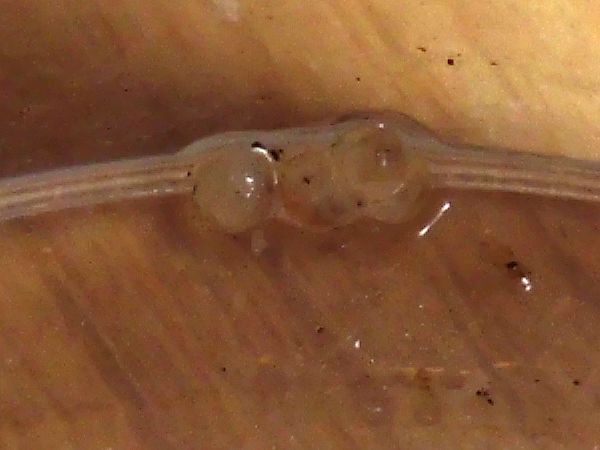 Dann habe ich mir die Eier etwas ausgebreitet, Foto und zählen (ich habe da so einige Erfahrungen mit der Zählung von Weberknecht-Kolonien gemacht): es sind 107 und das eine, das herumgetragen wird. Falls mir bei der Suche nicht noch welche entgangen sind.