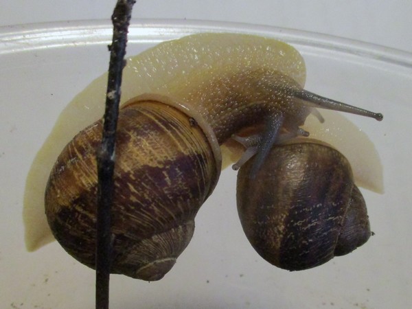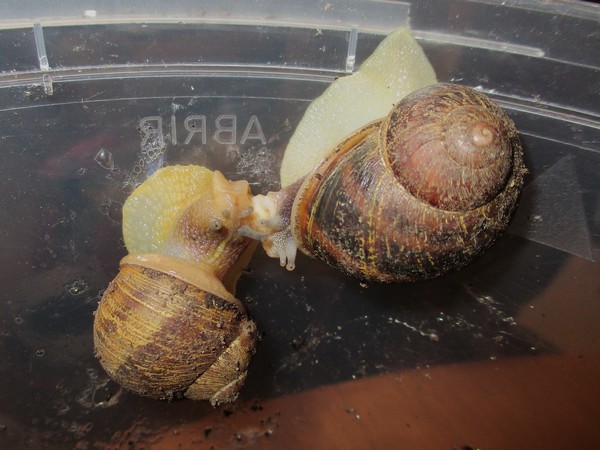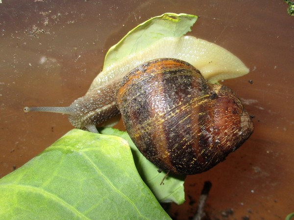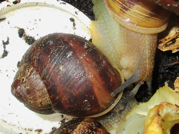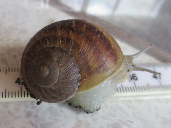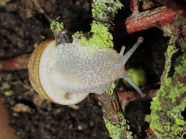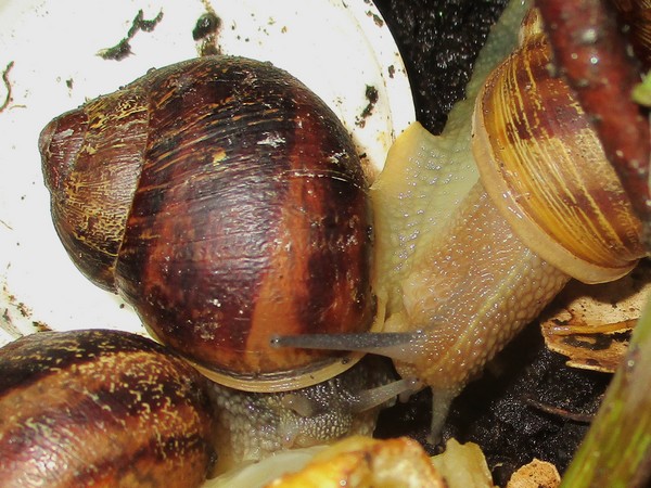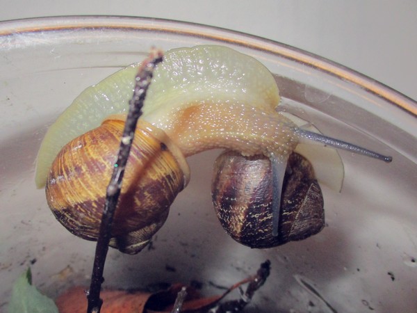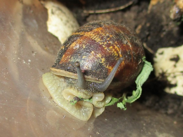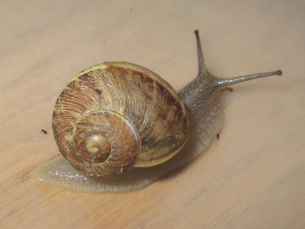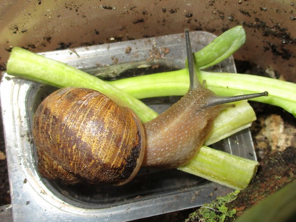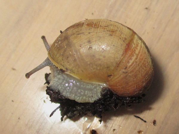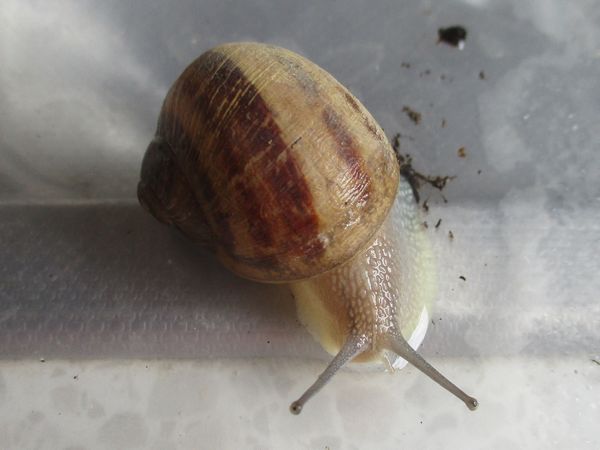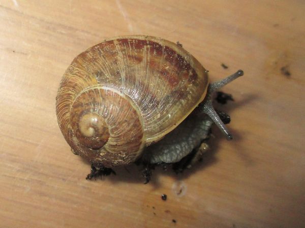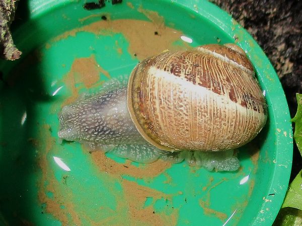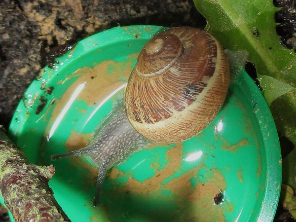 De Kleine ist jetzt meistens wach, schneckt durchs Gelände, futtert von der Gurke, schabt die Zweige ab, kontrolliert die Samen... In ihre Behausung habe ich ein kleines Deckelchen mit etwas Wasser und ein klein wenig Heilerde gesetzt. Ich hatte auch den Eindruck, dass sie da wohl mal dran war, und heute Nachmittag konnte ich dann auch beobachten, wie sie gerade ein Bad nahm.