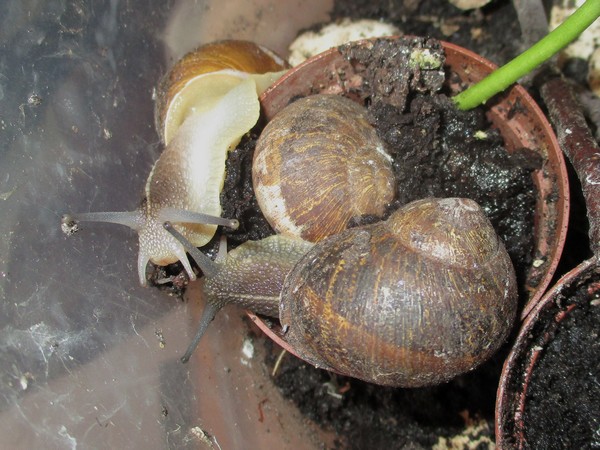 Offenbar hatten sie die Köpfe zusammengesteckt, um zu entscheiden, wer sich denn als nächstes um die Arterhaltung kümmert. Jedenfalls haben zwei von ihnen anschließend eine Menge Schleim produziert, und einen Liebespfeil sehe ich auch an der Wand kleben...
