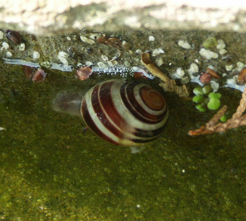 Da ich bisher davon ausgegangen bin, dass die Bänderschnecken reine Landschnecken sind, war ich schon etwas erstaunt, eine solche im Wasser schwimmend zu finden.