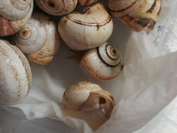 Das ist die Rückseite der beiden Tiere von oben. Wenn ich die Weichkörper vergleiche, dann finde ich die vermutete Eobania heller und glatter, die vermutete Cornu ist eher "noppig" und dreckig-beige.