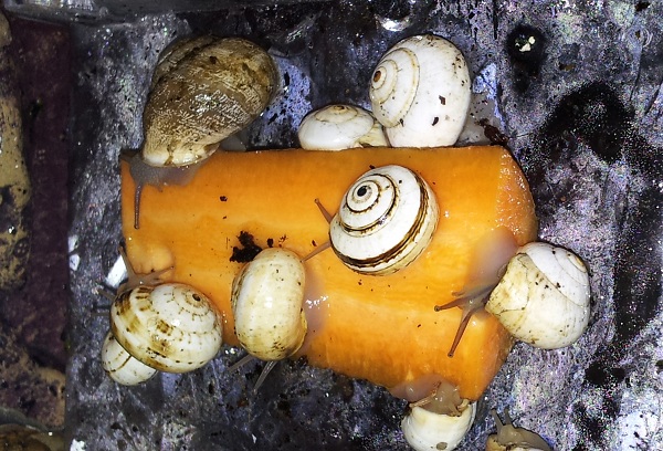 Bei den zwei Schneckenarten, die wie platte Cornus aussehen, ist die Ausfallrate hingegen sehr hoch. Es waren, wenn ich die Gehäuse mit Bildern aus dem Betz vergleiche, zwei otala dabei, die beide nicht mehr sind und die Eobania sterben mir überwiegend weg