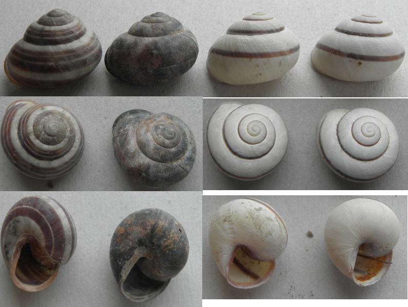 auch diese 4 Gehäuse stammen aus einer alten Sammlung, die ich - ohne Beschriftung - geschenkt bekommen habe. Sind das alles dieselben Arten? Vielleicht diesmal Cepaea hortensis?