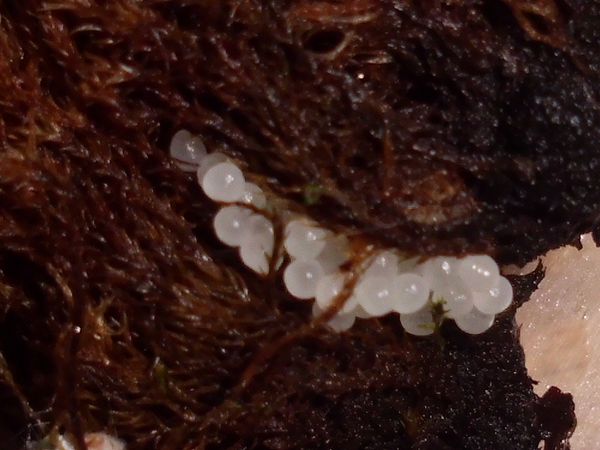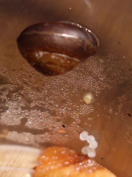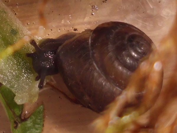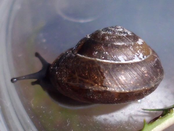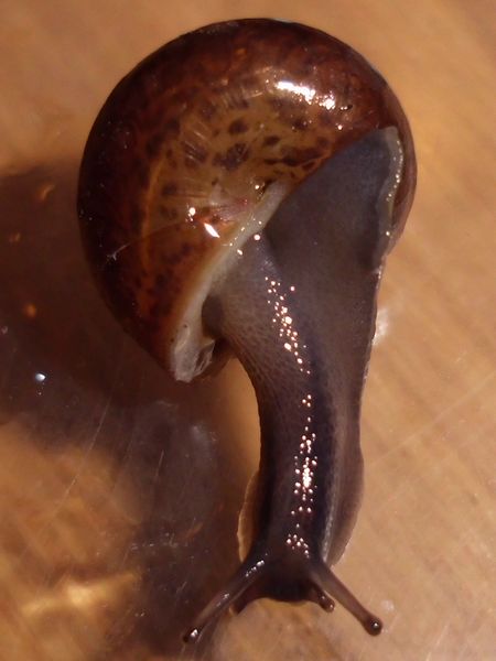Als ich auf dem Rückweg wieder dort vorbei kam, war es immer noch da, und ich wurde ganz spontan und habe es "eingesackt". (Ich glaube, das Scheckenvirus hat mich erwischt, allerdings eher der europäische Variante...) Der Kleine ist erstmal in eine kleine Dose gezogen und hat sich irgendwann darin auf Wanderschaft begeben. Als er am Decke saß, waren noch ein paar Bilder vom ganzen Schneck möglich. Was könnte es sein?