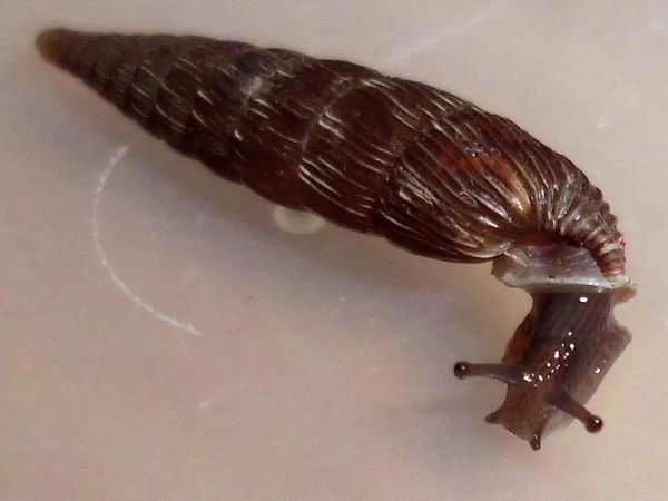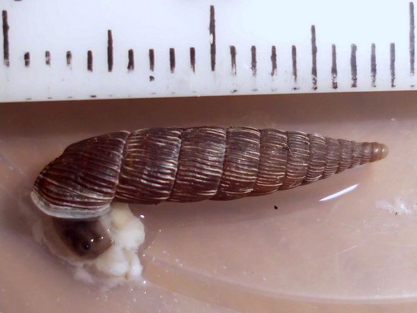 die vier Schließmundschnecken sind zusammen untergebracht (mit den beiden jungen Bänderschnecken, scheint gut zu funktionieren). Vor fünf Tagen entdeckte ich bei ihnen eine winzige Schnecke, die ich zunächst nicht einordnen konnte. Da ich grad ein paar flechtenbewachsene Zweige habe, von denen ich gelegentlich ein Stück in passender Größe abbreche, anfeuchte und dann zu den Schnecken gebe (die Zweiglein sind rucki-zucki blankgeputzt), hatte ich den Verdacht, dass ich damit was eingeschleppt haben könnte. Die vier Windungen verglich ich mit den Windelschnecken, Turmschnecken und ähnlichen, aber so richtig passte nichts, vor allem da die ersten drei Windungen zwar glatt aussahen, der letzte Umgang jedoch deutlich gerippt war.