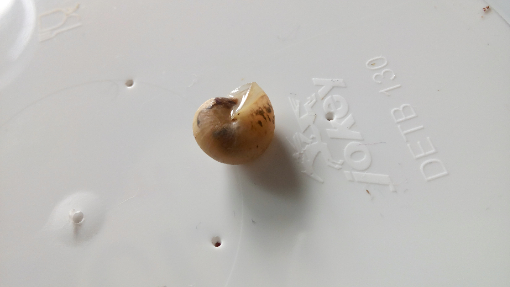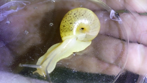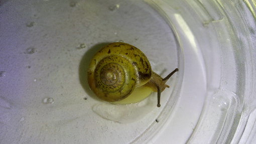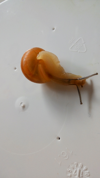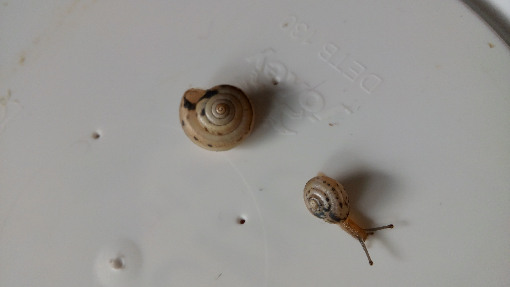 Nr.1: Ihr Haus ist etwa 1,7 cm lang. Und sie hat einfach eine der Schnecken von Nr.2 innerhalb von keiner halben Stunde Gefangenschaft aufgefressen...