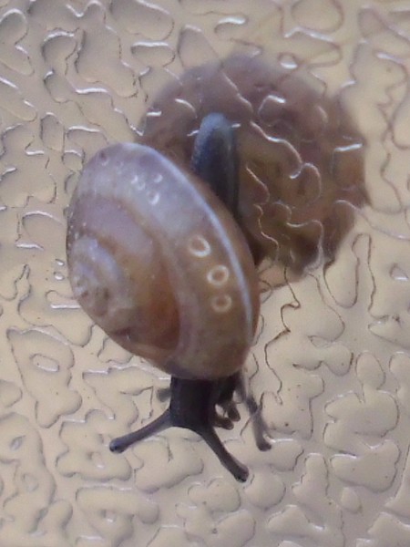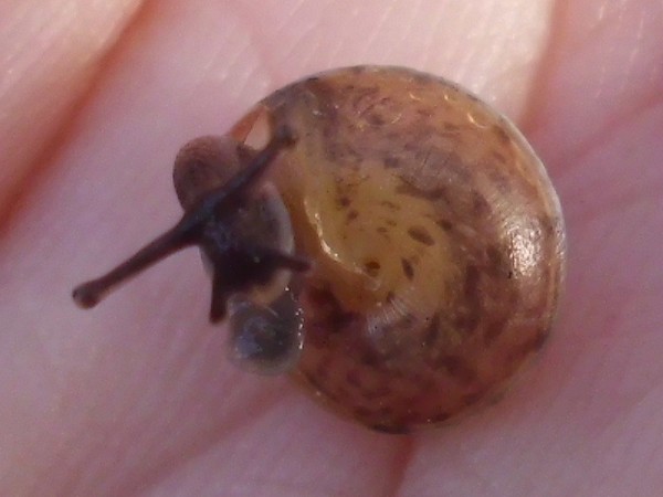 Da ich das für keine so gute Idee hielt (und außerdem nachsehen wollte, was für eine Schnecke es ist), habe ich das Tierchen für weitere Fotos und zum Wegbringen auf die Hand genommen. Das fand die Kleine wohl nicht besonders lustig...