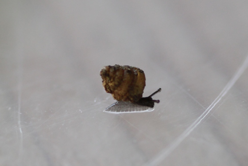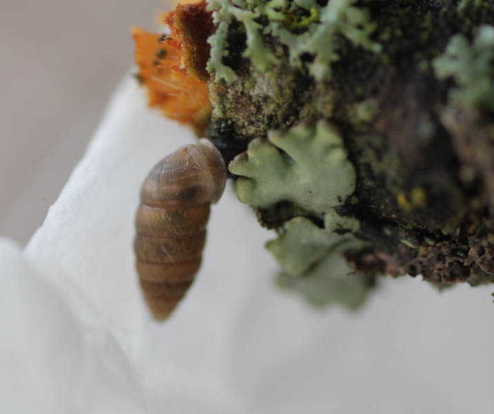 ich habe letzte Woche beim Spazierengehen ein paar leere Weinbergschneckenhäuschen gesammelt. Dabei habe ich auch ein paar sehr kleine Häuschen von einer mir unbekannten Schneckenart gefunden. Diese habe ich auch mitgenommen. Gestern beim Säubern der Helix-Häuser habe ich, obwohl ich sie extra vorort ausgeschüttelt hatte, drei ebensolche Schnecken und eine noch kleinere aus den Häuschen gespült. Durch gegens Licht halten konnte ich davon ausgehen, dass da wohl noch was im Häuschen dieser Zwerge ist. Habe sie in eine kleine Schale auf ein nasses Zewa gelegt und einen Deckel drauf. Als ich heute hinein geschaut habe, waren zwei der Ausgewachsenen und die kleine an unterschiedlichsten Stellen gesessen. Die Kleine hat ca. 1mm Häuschen und könnte eventuell ein Baby der anderen sein. Ich habe dann vorher gleich einen kleinen Flechtenast reingelegt und der wurde sofort von einer der "Größeren" besucht. Da schneckt sie nun entlang.