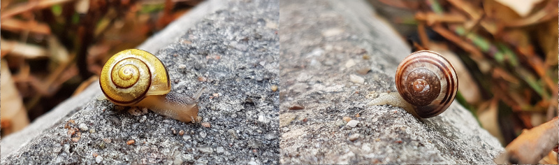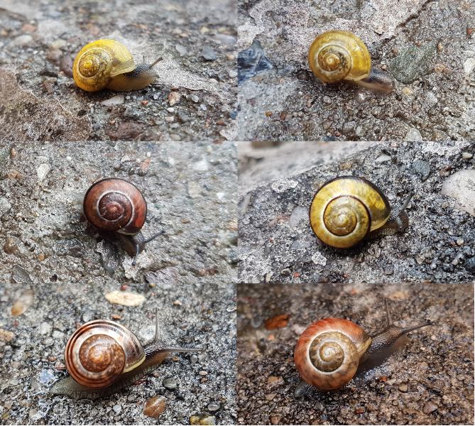 ich hoffe, daß ich den Kleinen beim Wachsen zusehen kann, so ein Garten ist für sie ja nicht ganz ungefährlich. Als ich die ganze Schar fotografierte, konnte ich auch zum ersten mal sehen, wie sich ein Schneckchen nach dem Futtern mitten auf der Mauer in aller Seelenruhe putzte. Ganz schön verwegen, denn hier gibt es rote Wegschnecken, Drosseln, Amseln und Singvögel. Bei einigen Schnecken sieht man auch Löcher im schönen Gehäuse