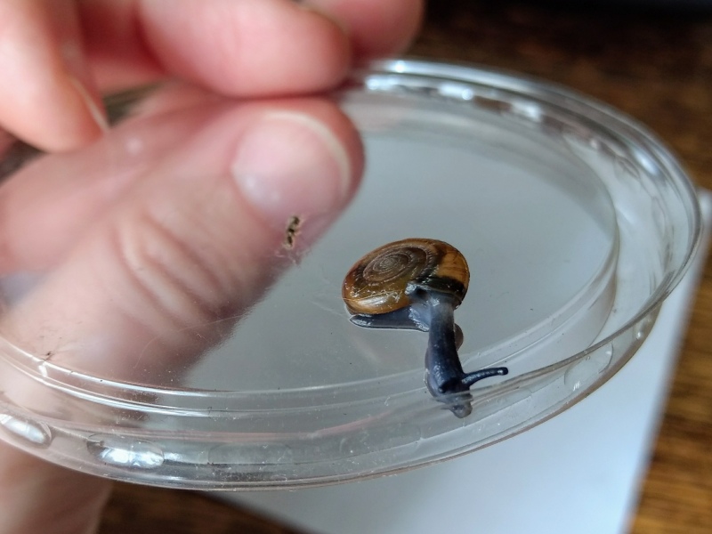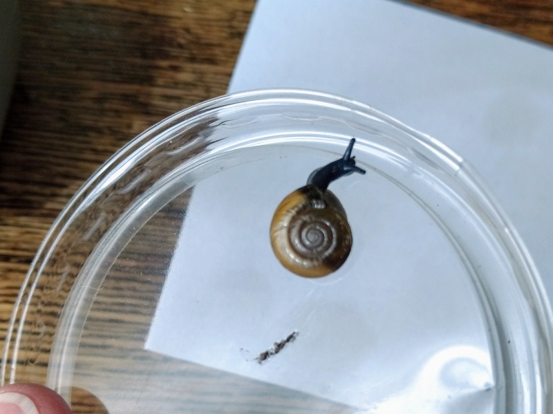 Gestern hat meine Tochter wieder eine Schnecke angebracht. Sie saß an unserer Haustreppe in einem Spalt, der mit Moos bewachsen ist.