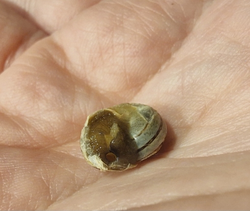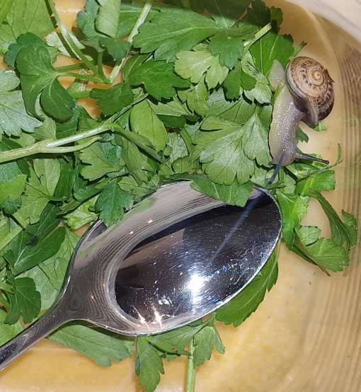 Gestern Nachmittag habe ich in einem eingeschweißten Tütchen mit frischer Petersilie aus Spanien eine Schnecke gefunden.