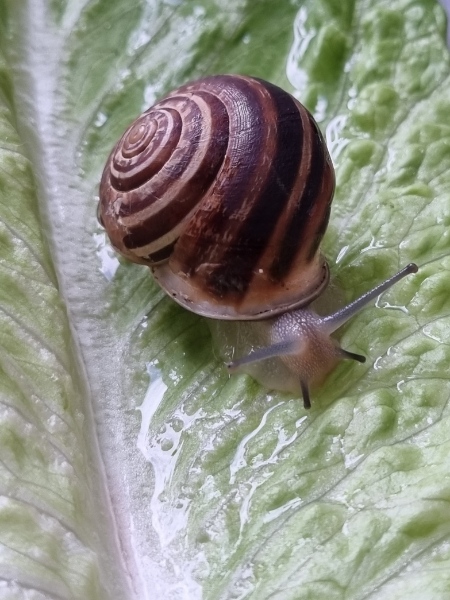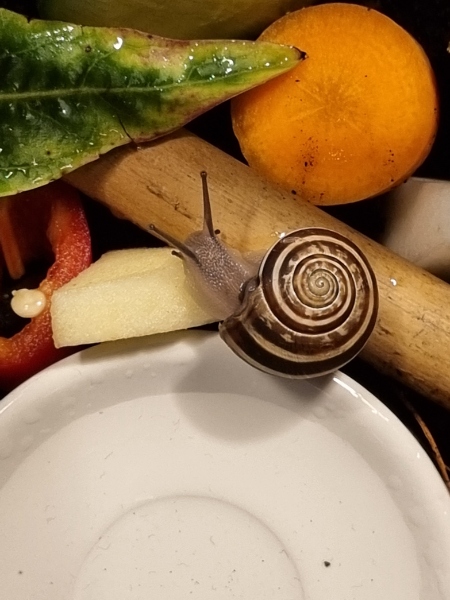 Ende Januar 2024 kam die (noch recht kleine) "Schnirkel" mit dem Löwenzahn vom türkischen Gemüsehändler zu uns. Seither lebt sie in einem "Terrarium", das ich wohl intuitiv sinnvoll ausgestattet habe. Nun ist sie auf ca 2,5/ 3 cm Durchmesser herangewachsen, was mir für eine deutsche Bänder-/Schnirkel oä etwas groß erscheint.