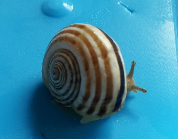 Mein Einzeltier, die Sombrero-Schneck. Sie ist tatsächlich noch nicht ausgewachsen, denn sie hat noch ein frisches Stück Wachstumsrand zugelegt. Sie ist sehr flink, extrem munter und frisst wie ein Scheunendrescher. Scheu ist sie ebenfalls kein bisschen und ihr Gehäuse ist wirklich fast flach. Ich mag sie.