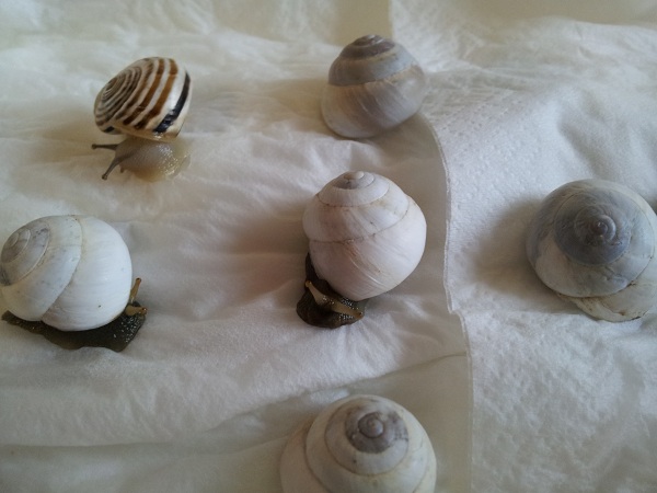 Die Theba pisana sind bis auf zwei Exemplare, die sich nicht rühren (da bin ich mir nicht sicher, ob sie noch leben) wohlauf, die Sphincterochila candidissima sind allesamt fit und die Sombrero-Schnecke (eventuell Pseudotachea splendida) hat sogar einen dicken Wachstumsrand zugelegt.