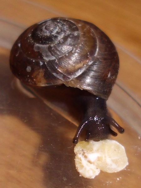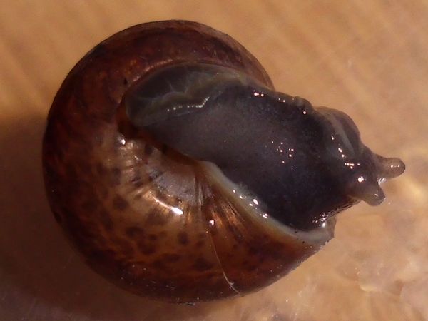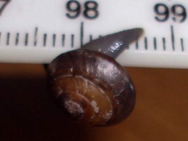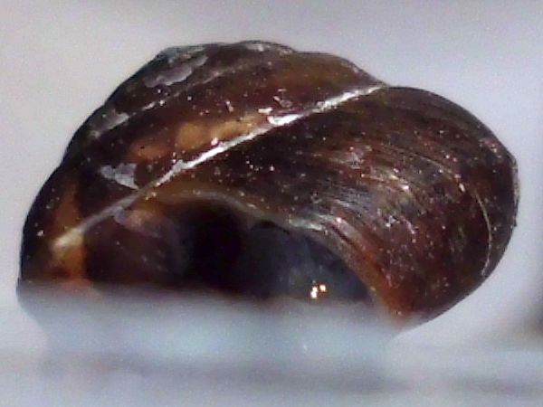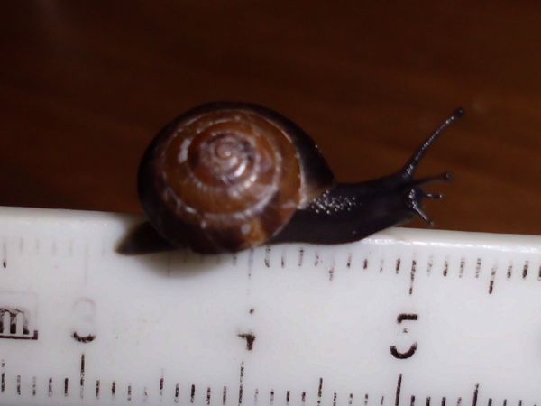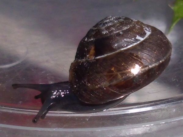 Als ich auf dem Rückweg wieder dort vorbei kam, war es immer noch da, und ich wurde ganz spontan und habe es "eingesackt". (Ich glaube, das Scheckenvirus hat mich erwischt, allerdings eher der europäische Variante...) Der Kleine ist erstmal in eine kleine Dose gezogen und hat sich irgendwann darin auf Wanderschaft begeben. Als er am Decke saß, waren noch ein paar Bilder vom ganzen Schneck möglich. Was könnte es sein?