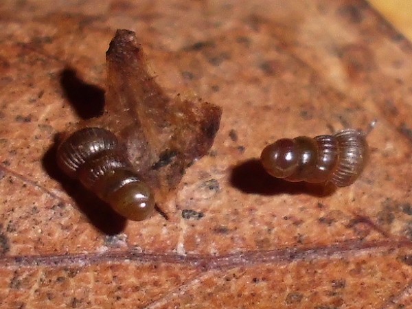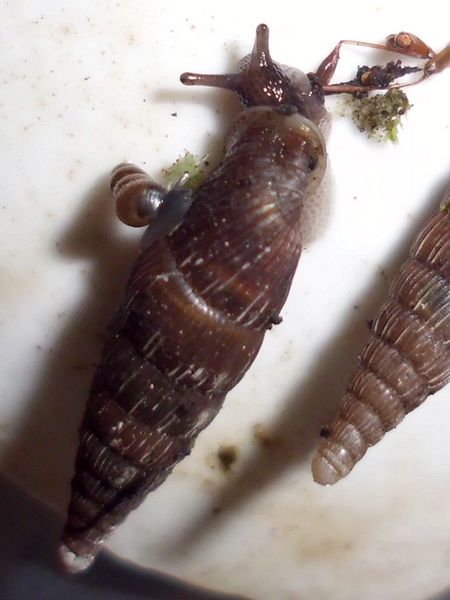 die vier Schließmundschnecken sind zusammen untergebracht (mit den beiden jungen Bänderschnecken, scheint gut zu funktionieren). Vor fünf Tagen entdeckte ich bei ihnen eine winzige Schnecke, die ich zunächst nicht einordnen konnte. Da ich grad ein paar flechtenbewachsene Zweige habe, von denen ich gelegentlich ein Stück in passender Größe abbreche, anfeuchte und dann zu den Schnecken gebe (die Zweiglein sind rucki-zucki blankgeputzt), hatte ich den Verdacht, dass ich damit was eingeschleppt haben könnte. Die vier Windungen verglich ich mit den Windelschnecken, Turmschnecken und ähnlichen, aber so richtig passte nichts, vor allem da die ersten drei Windungen zwar glatt aussahen, der letzte Umgang jedoch deutlich gerippt war.