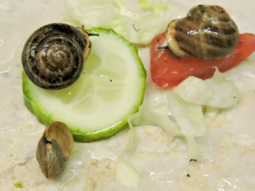 Er hat irgendwann einmal von seiner Istrien-Reise Schnecken mit nach Hause genommen und mir nun sein Glas mit Schnecken überreicht. Diesen Schnecken werde ich natürlich gerne ein gutes Zuhause geben. Dazu müsste ich aber wissen, was das für Schnecken sind und ob sie besondere Bedingungen benötigen. Sie kommen mir etwas dünn vor. Jetzt haben sie erst einmal Zweige mit Flechten, Sepiaschale, Tomate, Salat, Blätter und Gurke zum Knabbern.