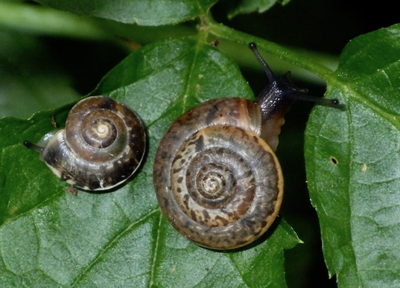 links eine kleine Kantige Laubschnecke Hygromia cinctella, rechts die etwas grössere, mir unbekannte Art!