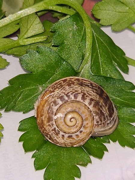 Gestern Nachmittag habe ich in einem eingeschweißten Tütchen mit frischer Petersilie aus Spanien eine Schnecke gefunden.