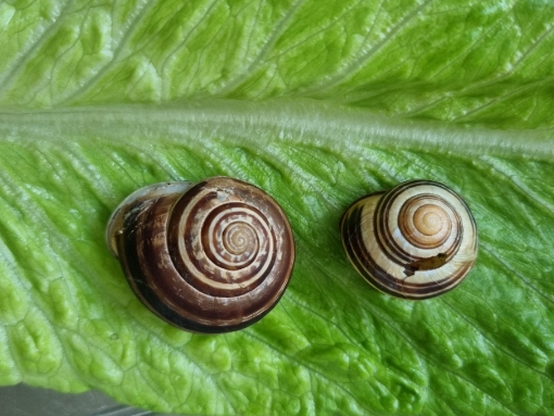 Ende Januar 2024 kam die (noch recht kleine) "Schnirkel" mit dem Löwenzahn vom türkischen Gemüsehändler zu uns. Seither lebt sie in einem "Terrarium", das ich wohl intuitiv sinnvoll ausgestattet habe. Nun ist sie auf ca 2,5/ 3 cm Durchmesser herangewachsen, was mir für eine deutsche Bänder-/Schnirkel oä etwas groß erscheint.