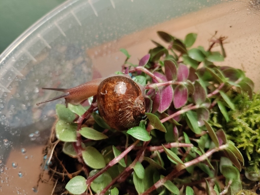 Mein Freund hat im Baumarkt eine Pflanze für meine Katze gekauft (callisia repens). Darin war eine Gehäuseschnecke, die er mir gleich mit übergeben hat, da ich schonmal einen Schnegel hatte.
