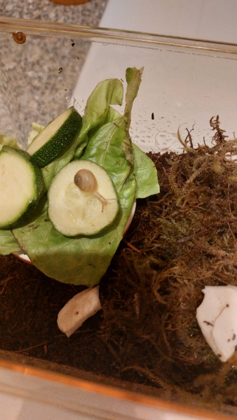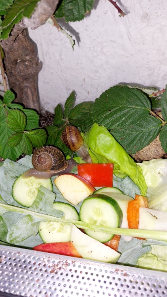 Wenn rausbringen noch eine Option wäre würde ich sie wohl einfach wieder zum Brombeerstrauch bringen. Da sie im selben Terrarium sind stell ich mir die Suche nach den Minieiern etwas schwierig vor. Auf diesem Strauch sind wohl sehr viele Laubschnecken, da ich immer wieder Blätter entdecke, an denen so winzige Schmeckis sind
