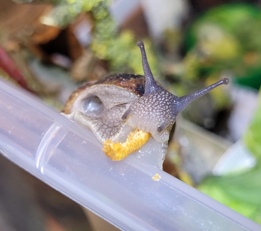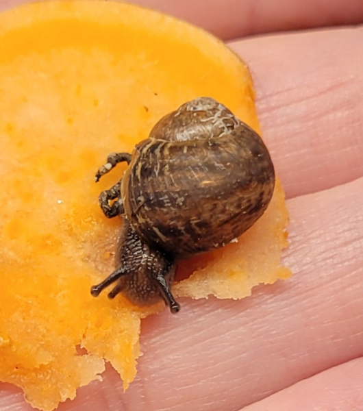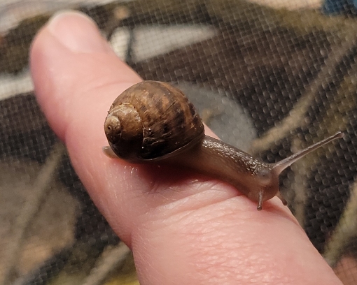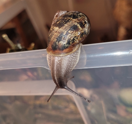 Er ist dann in meine Schnecken-Winter-Pflegebox eingezogen, zusammen mit kleinen Weini- und Bänderbabys, einer Bänderschnecke mit kleinerem Gehäuseschaden und später auch noch mit Klärchen.....