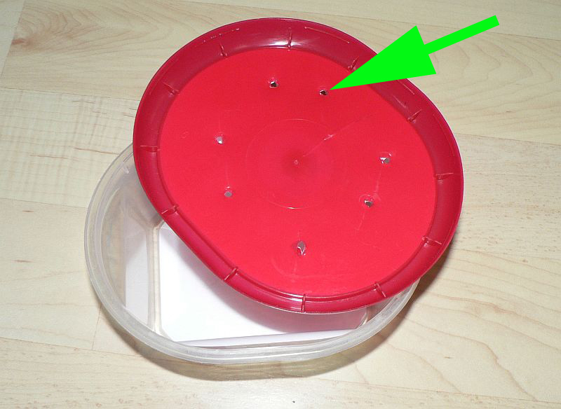 2. In den Deckel der Plastikdose Löcher machen (von innen nach außen).