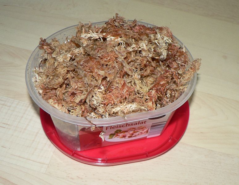 3. Aufgeweichtes Sphagnum-Moos oder Terrarienerde in die Plastikdose geben: