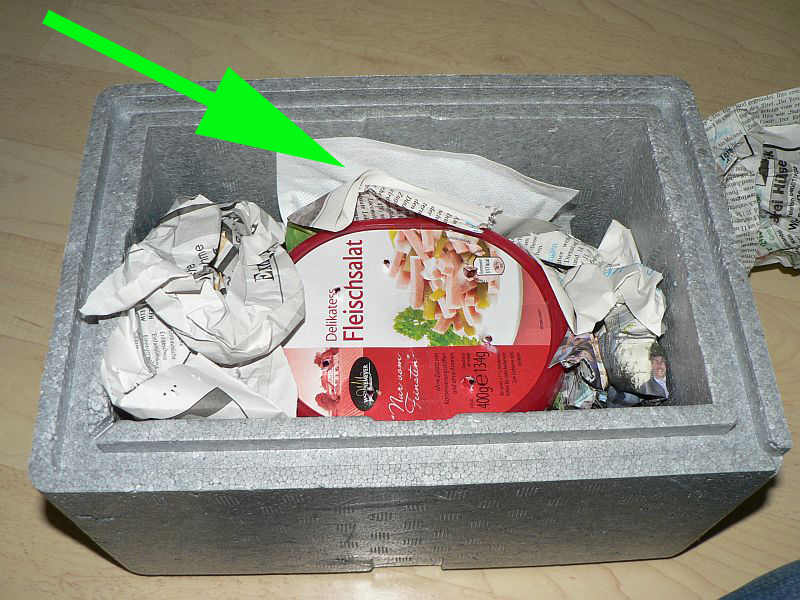8. Heatpack reinlegen (vorher öffnen und wenn nötig schütteln). Falls das Heatpack zur Wärmeerzeugung Sauerstoff benötigt: ein Loch in die Styroporbox machen, an welchem es liegt. Die meisten Heatpacks benötigen Sauerstoff!