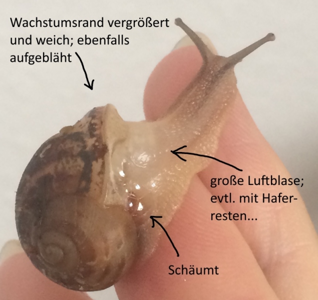 Ich habe es erst nicht richtig gesehen und sie vorsichtig rausgehoben. Sie hat ziemlich geschäumt aber war dann dennoch recht aktiv auf der Hand.Ihr Zustand: Der Kropf (wie ich ihn jetzt erkannt habe) ist total aufgebläht, die Haut ist dort dünn und man kann regelrecht die Luft im Inneren sehen. Das Haus ist dadurch ebenfalls nach außen gewöhlt und der weiche Wachstumsrand nun sehr sehr breit. Auf dem Foto ist zu erkennen, dass dieser ganze weiche Teil viel heller und anders gemustert ist als der Rest. Das Atemloch ist noch offen, habe aber Angst, dass sie nicht mehr richtig atmen kann, sollte es noch weiter schwellen