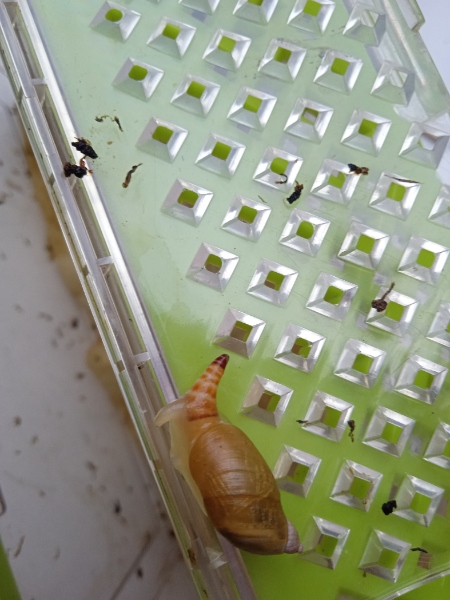 diese Schnecke war mit bei denen die ich am Mittwoch während dem Hochwasser gerettet habe. Heute wurden fast alle ausgesetzt. Diese Bernsteinschnecke kam mir seltsam vor weil sie irgendwie keine richtigen Pupillen hatte, der Körper anders aussah und im Haus irgendwas rotes 'pochte' es bewegte sich jedenfalls. Grade habe ich mir das nochmal angeguckt und jetzt ist es im Fühler