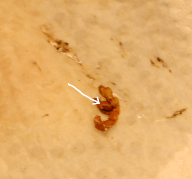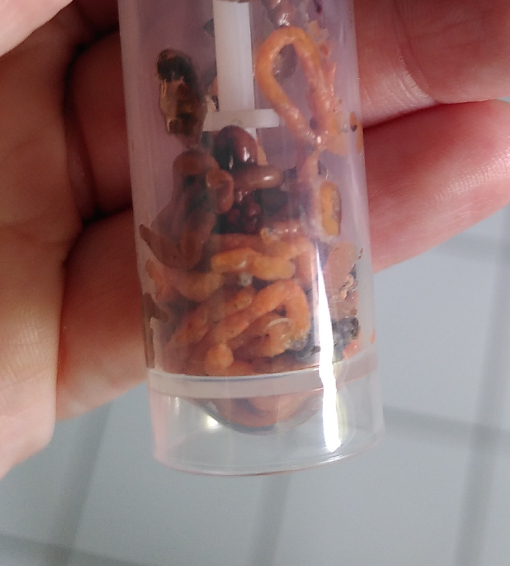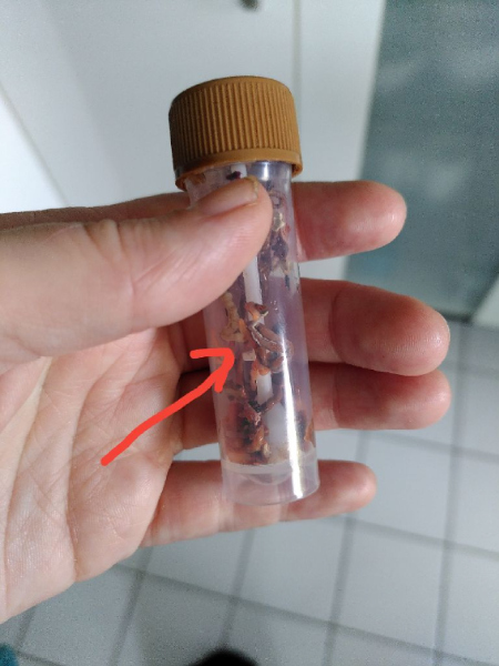 Ansonsten habe ich heute noch mal eine Kotprobe losgeschickt - und diesmal direkt Würmer mit reingetan, die ich an den stark befallenen Schnecken ja wie gesagt einfach vorsichtig abkratzen kann. Die sind da in dem zurückgezogenen Bereich vom Mantelsaum zuhauf.