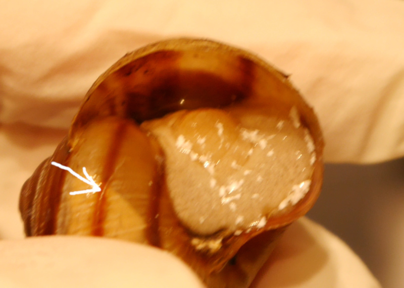 Der Mantelsaum ist ja weiterhin links viel weiter eingezogen als am Nabel und steckt da fest. Wenn man genau guckt, sieht man einen kleinen Spalt zwischen Gehäuse und Mantel. Ich hoffe, man kann es auf dem Foto erkennen? Da sind Würmer drin. Die werden ja mit dem Kot ausgeschieden, sind also logischerweise immer auf der linken Seite, wenn man so auf die Schnecke schaut. Vielleicht, wenn da der Kot länger hängt, nisten sich die Würmer irgendwie auch dort ein? Ich weiß es nicht, aber irgendwie scheinen die Würmer dafür zu sorgen, dass sich der Mantel dort so stark zurückzieht und nicht mehr nach vorne kommen kann. :-?