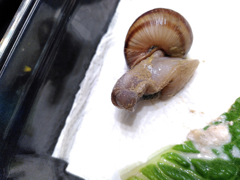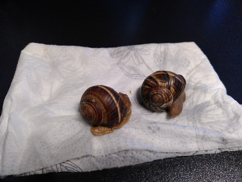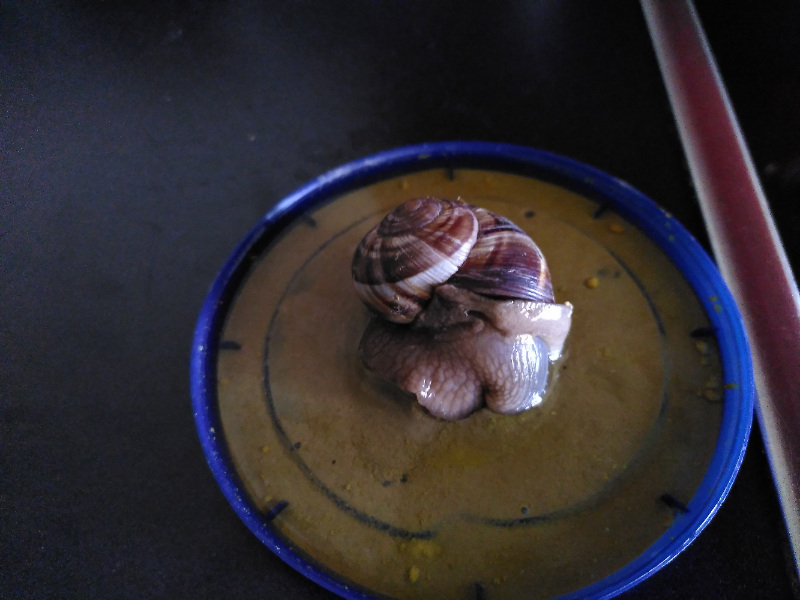 Eben hat sie versucht, Süßkartoffel zu raspeln und es nicht hinbekommen. Brei füttern ging aber noch. Dafür rollt sie sich schon genauso nach links ein wie Schneck 2. Insgesamt sieht sie aber noch ok aus. Das Interessante ist, dass Schneck 4 bis gestern seit letzter Woche irgendwann im Trockenschlaf am Glas hing, also erst aufgewacht ist, nachdem alles los ging. Ich hatte mal Schneckenmilben, habe aber im März Raubmilben im Terrarium verteilt. Danach wäre mir jetzt keine mehr aufgefallen, aber der Befall war auch vorher nicht wild (sonst hätte ich zum Ameisenspray gegriffen). Ansonsten werden sie genauso gepflegt wie sonst auch immer.