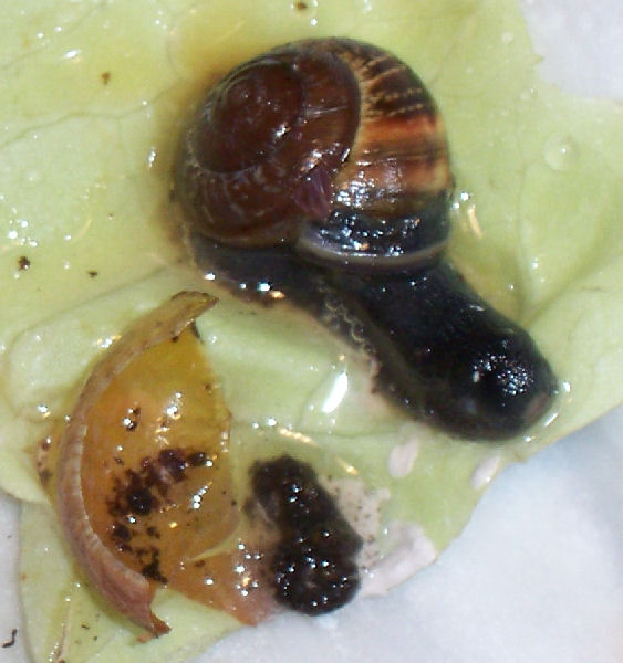 Sie reagiert noch immer auf Wasser. Man sieht Bewegung im Fuß. Allerdings sieht man keine Fühler, keine Augenstiele. Sie sitzt auf nassem Salat, der mit Kalk bepudert ist. Als Behausung dient eine Faunabox, es ist gut aufgekalkter Kokoshumus drin, auch gut feucht. Futter ist auch da, Salat, Löwenzahn und es gibt was zum Klettern.
