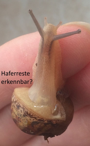 Ich habe es erst nicht richtig gesehen und sie vorsichtig rausgehoben. Sie hat ziemlich geschäumt aber war dann dennoch recht aktiv auf der Hand.Ihr Zustand: Der Kropf (wie ich ihn jetzt erkannt habe) ist total aufgebläht, die Haut ist dort dünn und man kann regelrecht die Luft im Inneren sehen. Das Haus ist dadurch ebenfalls nach außen gewöhlt und der weiche Wachstumsrand nun sehr sehr breit. Auf dem Foto ist zu erkennen, dass dieser ganze weiche Teil viel heller und anders gemustert ist als der Rest. Das Atemloch ist noch offen, habe aber Angst, dass sie nicht mehr richtig atmen kann, sollte es noch weiter schwellen