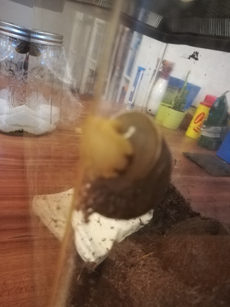 Wir waren vier Tage in Urlaub, nicht gesehen haben wir die Schnecken aber nur zwei Tage (am An- und Abreisetag war alles ok). Als Proviant hatten sie Gurke und Eisbergsalat sowie Sepia. Am nächsten Tag der Schock - eine der Schnecken sah unfassbar komisch aus, ich war der Überzeugung, dass sie tot ist. Sie quoll aus ihrem Häuschen, man hat fast keinen Körper gesehen, es sah aus wie eine Blase. Der Mantelsaum war total aufgequollen. Ich habe sie dann angesprüht und siehe da: Die Schnecke kam komplett zum Vorschein und schneckte fröhlich umher. Ich habe sie separiert, seitdem ist sie auf Diät. Später dasselbe Problem: Der Mantelsaum ist geschwollen, sie kommt nicht ins Häuschen. Nach einer Auffoderung kam sie aber auch hier wieder raus und kroch umher - sobals sie kriecht, sieht sie ganz normal aus. Dabei setzte sie auch ordentlich Kot ab - ich habe dabei durch das Entfernen des Kots etwas "nachgeholfen", da ich das Gefühl hatte, dass sie den nicht richtig rausbekommt und irgendwie verstopft ist. Tatächlich wurde sie danach viel munterer, schwoll ab und setzte direkt eine ordentliche weitere Ladung ab. Ich bilde mir eine gelbliche Verfärbung des Fußes ein.