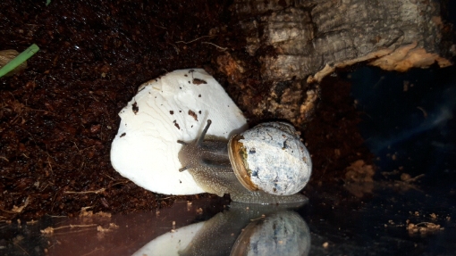 Die gefundene Schnecke hat ein weißes, ziemlich brüchig aussehendes Haus, als hätte er Kalkablagerungen drauf. Wir vermuteten, dass die wegen Kalkmangel an ihrem Haus geknabbert hat und haben die erstmal aufgenommen und viel Sepia, Wasser, etwas Gurke und Heilerde gegeben.