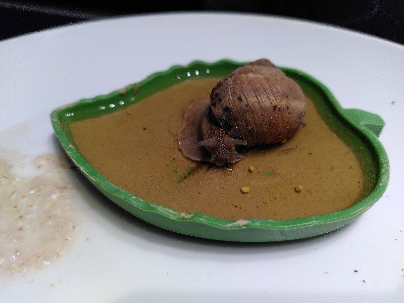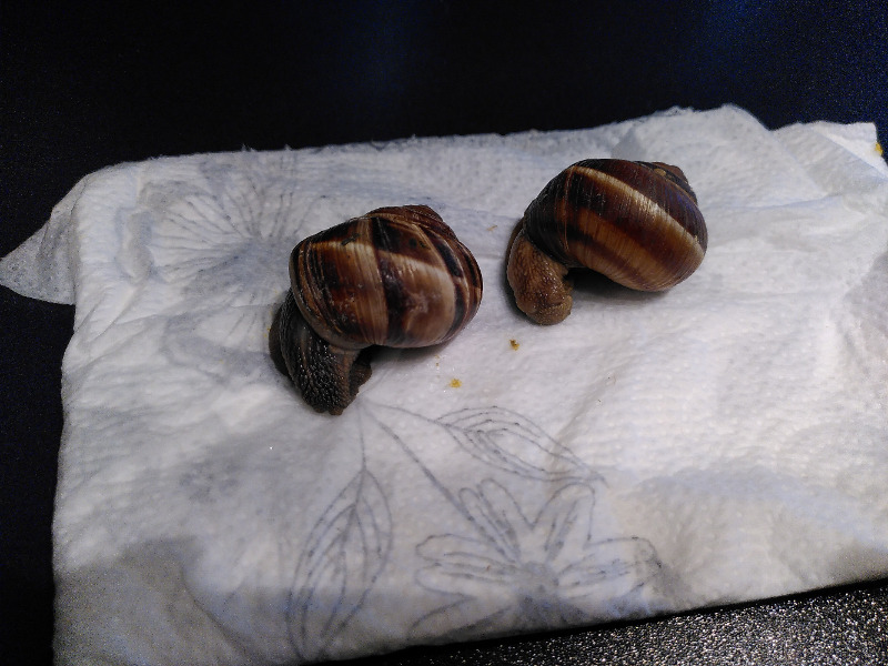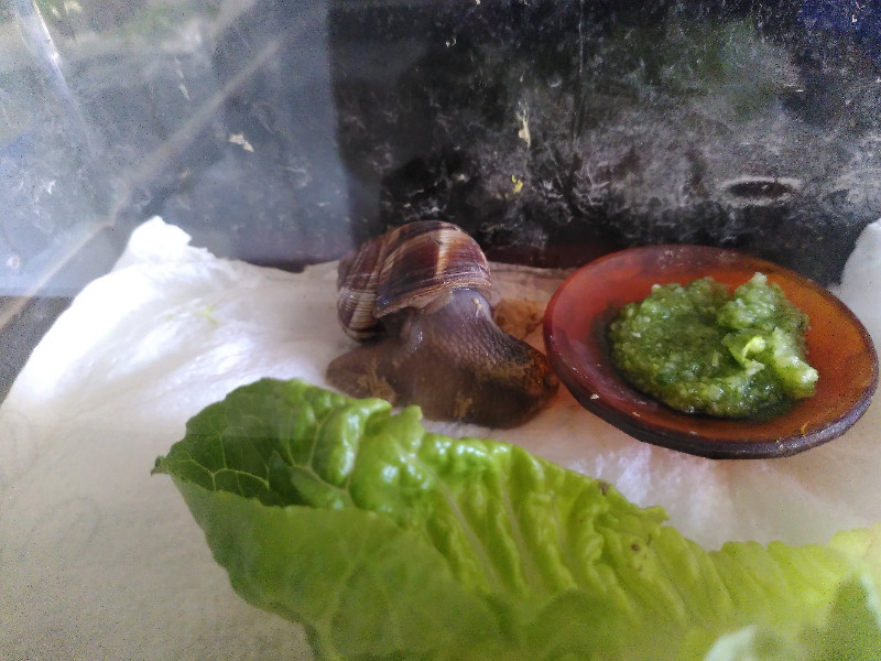 Eben hat sie versucht, Süßkartoffel zu raspeln und es nicht hinbekommen. Brei füttern ging aber noch. Dafür rollt sie sich schon genauso nach links ein wie Schneck 2. Insgesamt sieht sie aber noch ok aus. Das Interessante ist, dass Schneck 4 bis gestern seit letzter Woche irgendwann im Trockenschlaf am Glas hing, also erst aufgewacht ist, nachdem alles los ging. Ich hatte mal Schneckenmilben, habe aber im März Raubmilben im Terrarium verteilt. Danach wäre mir jetzt keine mehr aufgefallen, aber der Befall war auch vorher nicht wild (sonst hätte ich zum Ameisenspray gegriffen). Ansonsten werden sie genauso gepflegt wie sonst auch immer.