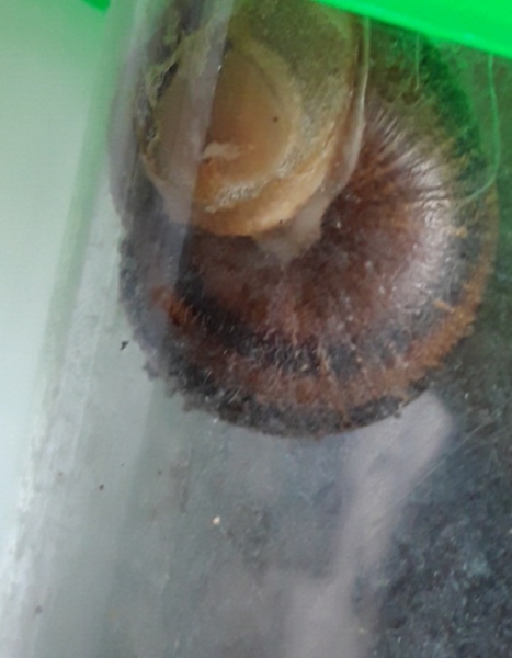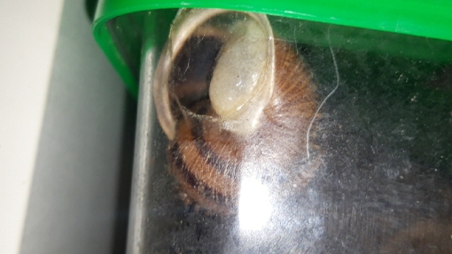 Genu ist mit 3 anderen Schnecken zusammen im Terrarium und hat sich am 17.06 (nachdem er etwas unterwegs war) an die Decke geklebt und hat als einzige im Terrarium angefangen Trockenruhe zu machen (haben wir zumindest so vermutet). Da es zu dieser Zeit auch wieder Wärmer draußen geworden ist, haben wir uns auch nichts dabei gedacht. Genu ist dann nochmal am 22.06 von der Decke geplumst und ist dann auch wach geworden, hat kurz die Reste von seiner Verklebung vom Häuschen geknabbert und hat sich dann diesmal an die Scheibe angeklebt. Da ist uns schon aufgefallen, dass der Körper an der Seite des Atemlochs mehr ins Haus gezogen ist als der Rest, da aber noch genug von der Schnecke zu sehen war, haben wir auch wieder nichts großartig dabei gedacht.