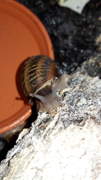 Die Haltungsparameter sind wie immer eine Feuchtigkeit von ca. 60% im Terrarium, durch die Wetterumschwünge wahrscheinlich von der Temperatur her etwas belastender für die Schleimer. Die Schnecken bekommen wegen der Hitze in letzter Zeit etwas mehr Gurke, damit sie auch auf diesem Wege mehr Wasser zu sich nehmen, ansonsten wie immer Zucchini, Süßkartoffel, Möhren, Salat und manchmal anderes Gemüse abwechselnd. Sepia, genug Wasser und Heilerde haben die natürlich immer zur Verfügung gestellt.