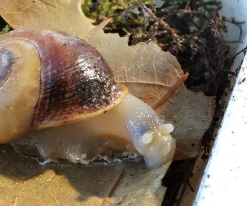 Ich habe die Schnecke in eine kleine Box mit Moos auf ein Blatt gelegt. Für den Fall, dass sie doch Kontakt mit einer schädlichen Substanz hatte, habe ich ihr ein Heilerdebad gemacht und sie etwa 2 Minuten drin liegen gehabt.