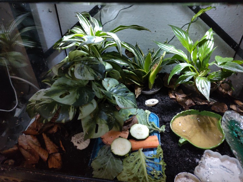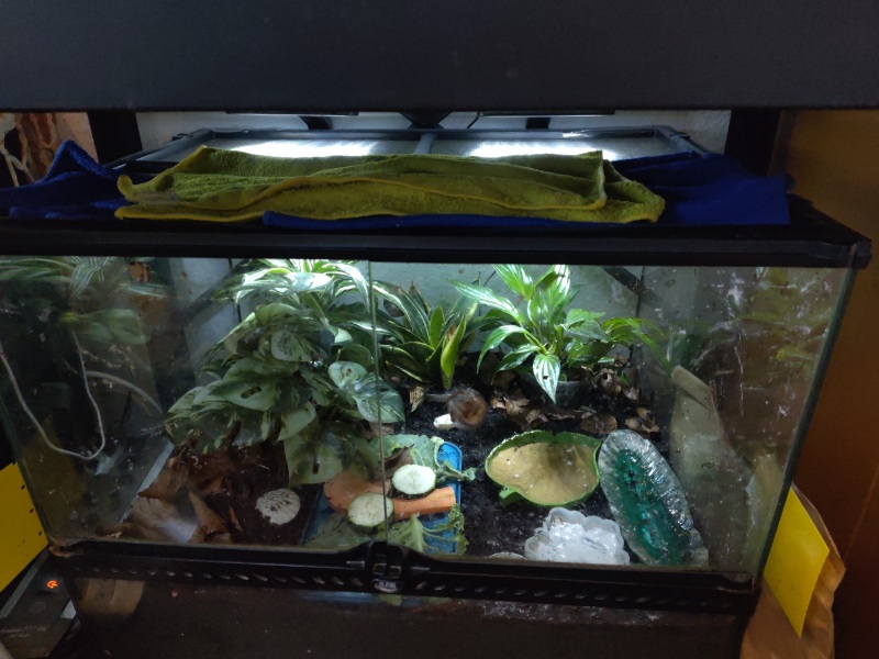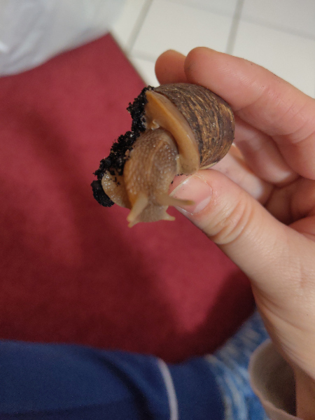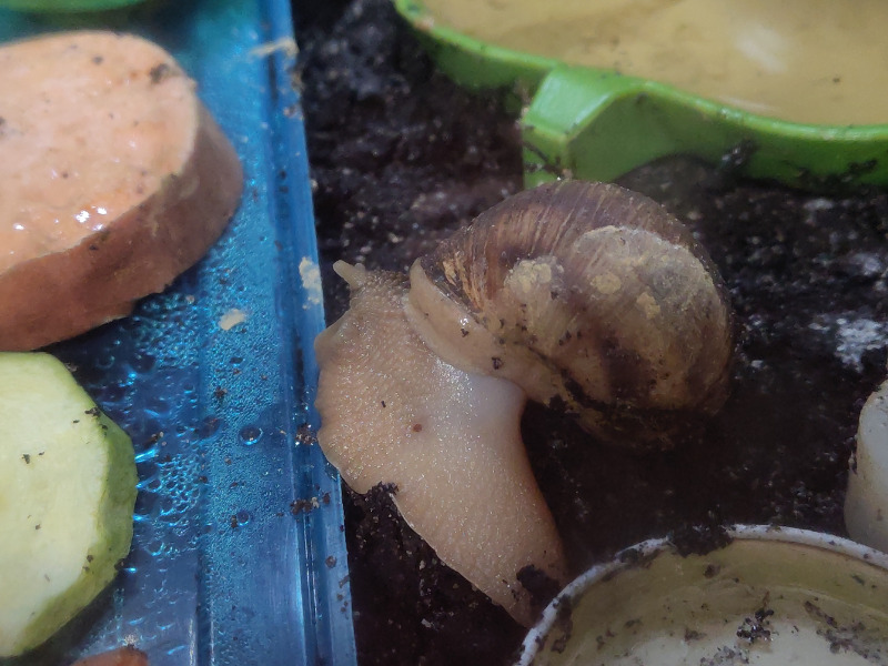 Wie hoch die Luftfeuchtigkeit ist, weiß ich nicht, ich halte sie aber insgesamt eher gering, auch weil es gar nicht anders geht hier. Meine Wohnung hat nur 35 % Luftfeuchtigkeit und sie haben ja das Netz oben drüber. Da lege ich feuchte Tücher über einen Teil, damit es bei den Schnecken nicht so trocken ist. Aber ich traue mich nicht zu viel und mache lieber weniger als mehr, weil es sonst doch schnell stickig wird da drinnen. Wenn es draußen schüttet, sprühe ich drinnen dann auch mal, dann buddeln sie sich alle aus und schnecken rum. Also halt wechselnde Phasen zwischen trockener, wo sie sich dann eingraben, und nasser, dann sind sie aktiv, dann können sie wieder was schlafen. Manche sind auch so einfach ein paar Tage lang aktiv, während andere wochenlang schlafen, aber ganz grundsätzlich ist das so der Aktivitätsrhythmus. Das letzte Mal gesprüht und das Terrarium feuchter gemacht habe ich am Donnerstag, als es hier geschüttet hat. Seitdem hab ich nur die Tücher oben drauf feucht gehalten. Vielleicht ist es dadurch aber doch etwas zu feucht geworden? Nur müsste der Rest ja dann auch so ein Verhalten zeigen, und die sind weiter alle eingegraben.